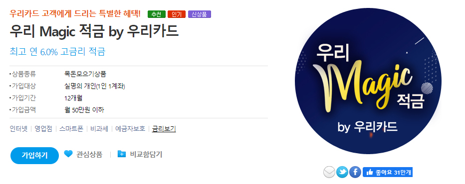 먼저, 소개해드릴 상품은 우리 magic 적금 by 우리카드입니다. 우리은행 및 우리카드 실적에 따라서 최고 연 6% 금리를 제공하는 상품이에요.