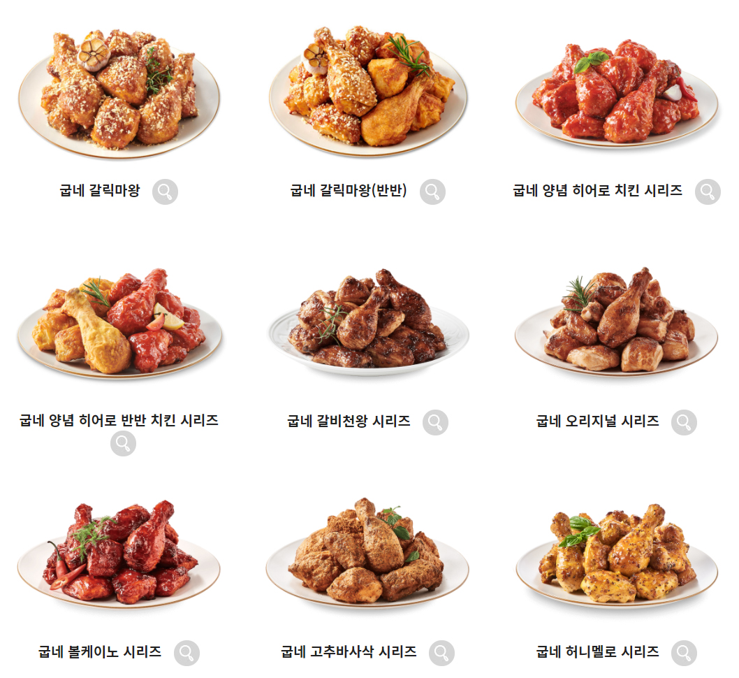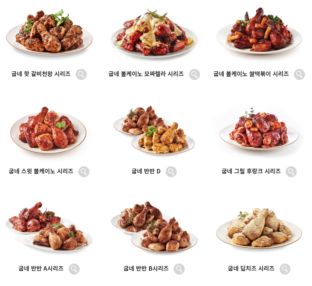 핫 갈비천왕 시리즈, 볼케이노 모짜렐라 시리즈, 볼케이노 쌀떡볶이 시리즈, 스윗 볼케이노 시리즈, 굽네 반반D(오리지널+허니멜로), 그릴 후랑크 시리즈, 반반 A(오리지널+볼케이노), 반반B(오리지널+갈비천왕), 딥치즈 시리즈, 굽네 오리지널 콤보가 있습니다.