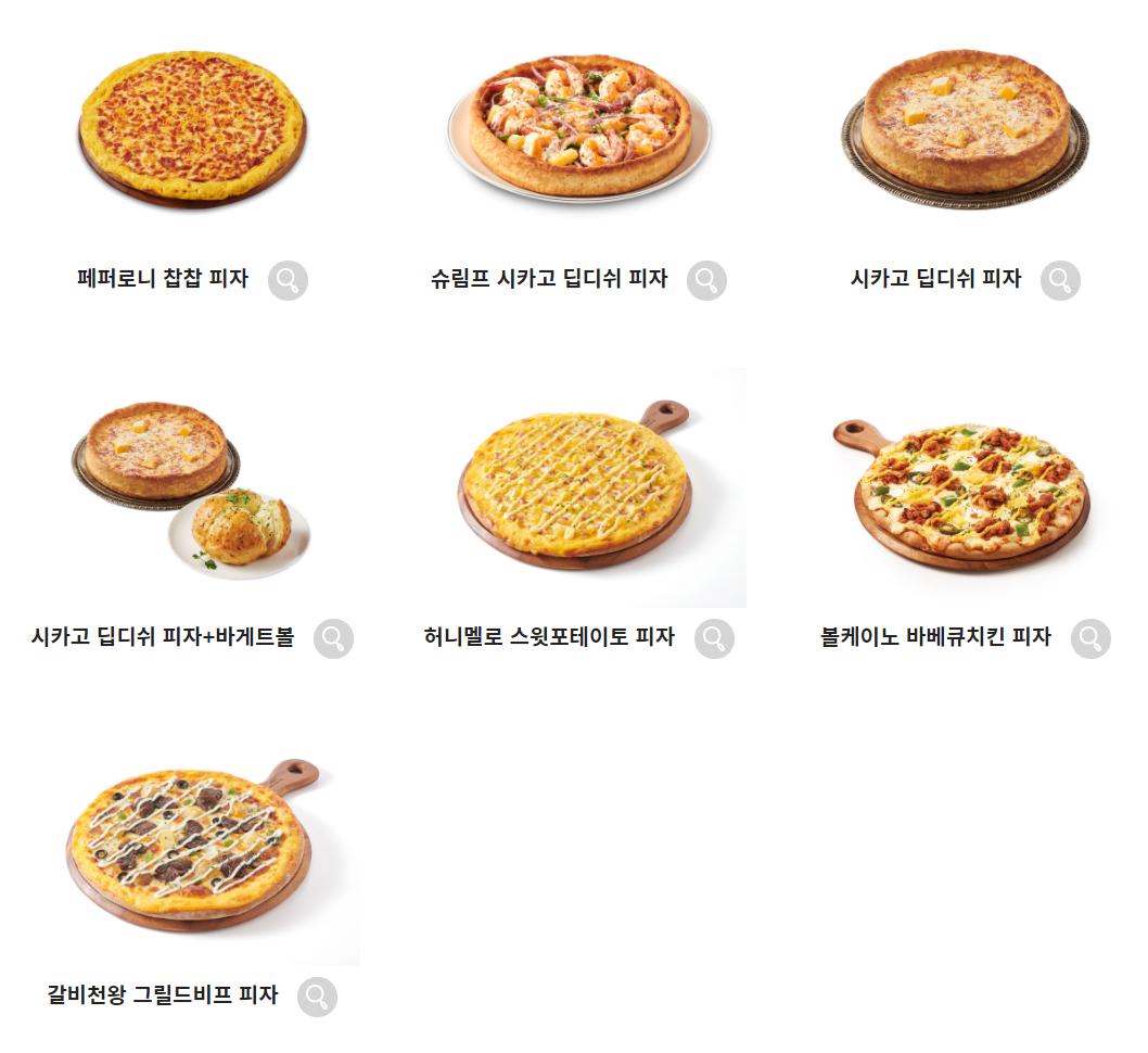 다음 굽네치킨 메뉴는 피자 시리즈가 있습니다. 페퍼로니 찹찹 피자, 슈림프 시카도 딥디쉬 피자, 시카고 딥디쉬 피자, 허니멜로 스윗포테이토피자, 볼케이노 바베큐치킨 피자, 갈비천왕 그릴드비프 피자가 있네요.